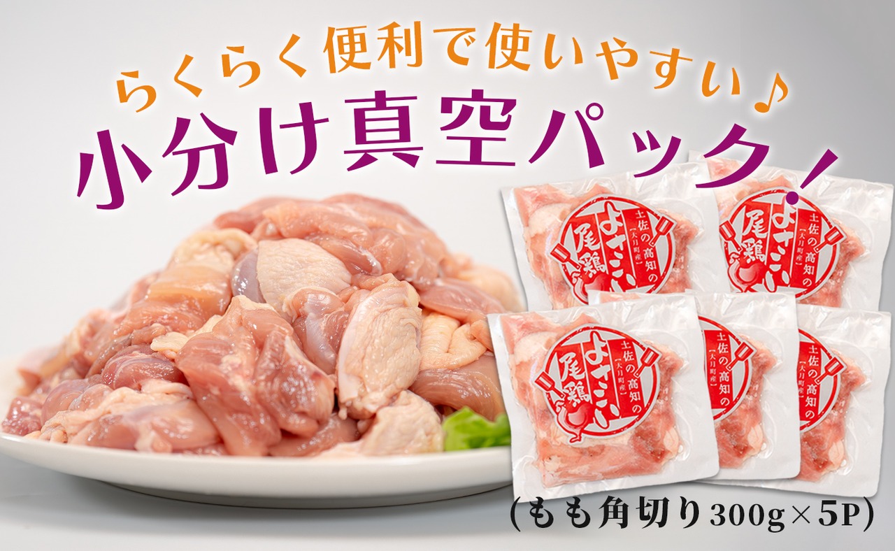 徹底した衛生管理のもと育てられた、大月町の新しいブランド鶏「よさこい尾鶏」もも角切り1.5kg(300g×5パック)をお届けします。